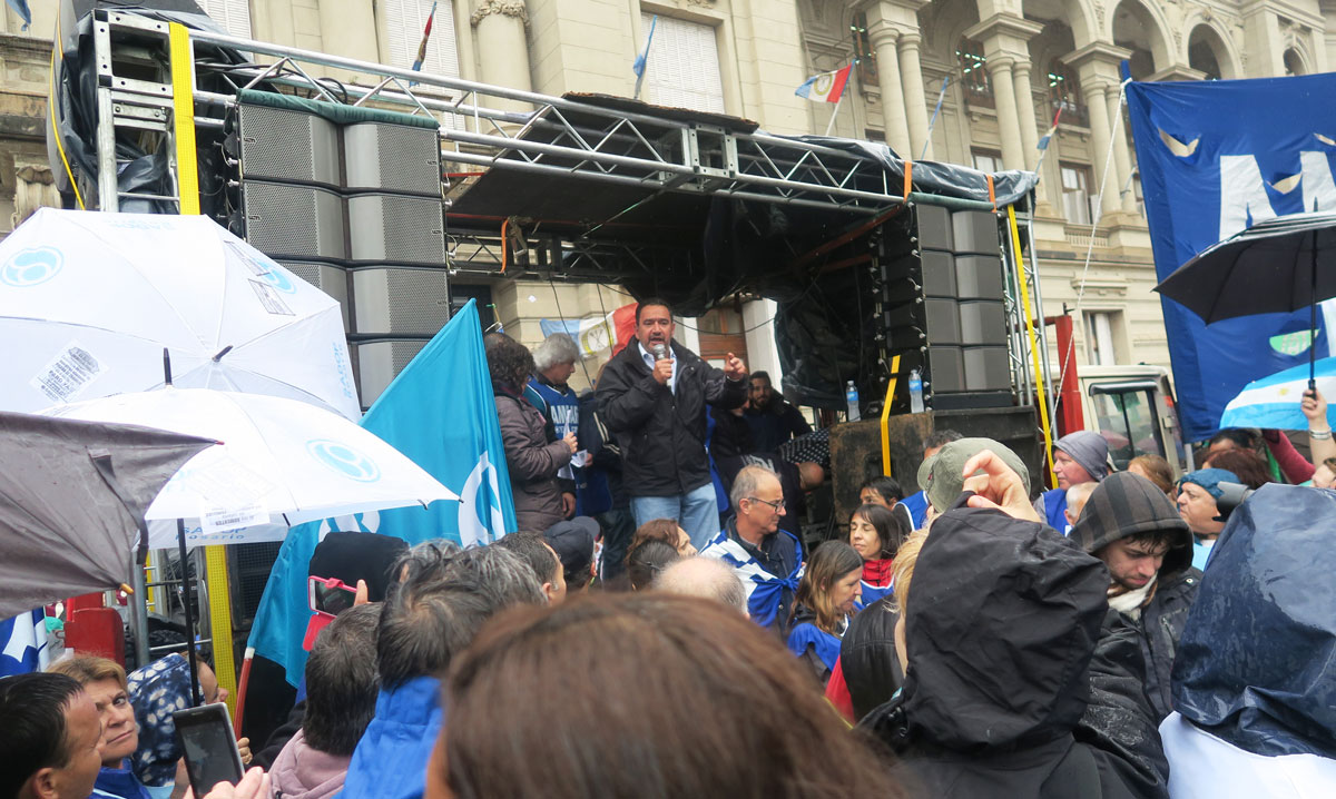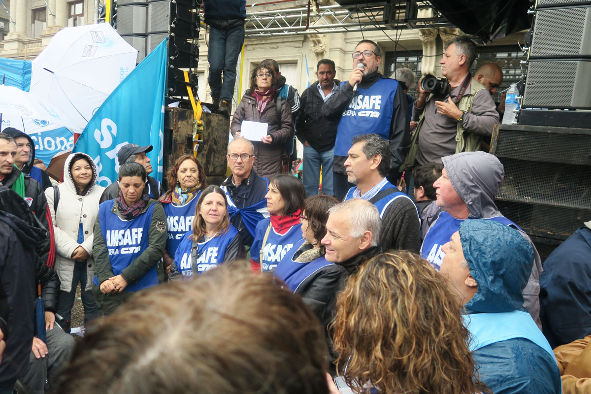 En el acto, el Secretario General se expresó en representación de las otras organizaciones sindicales que acompañaron la movilización. Leoni sostuvo que el reclamo de apertura de paritarias es una lucha de todos los gremios estatales y la defensa del sistema previsional, un compromiso ineludible del conjunto de los trabajadores activos y pasivos, ante los embates del Gobierno Nacional que busca aumentar las edades jubilatorias y reducir los montos de las prestaciones.